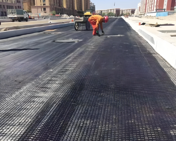 沥青摊铺时,高温沥青会进一步融化自粘层,让格栅与沥青面层也能牢固粘结,形成 “水泥板 – 格栅 – 沥青层” 的三层稳定结构。