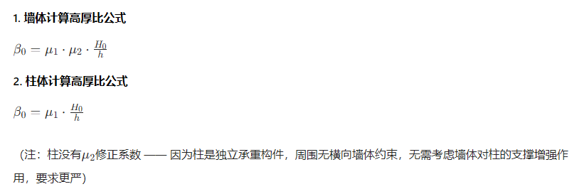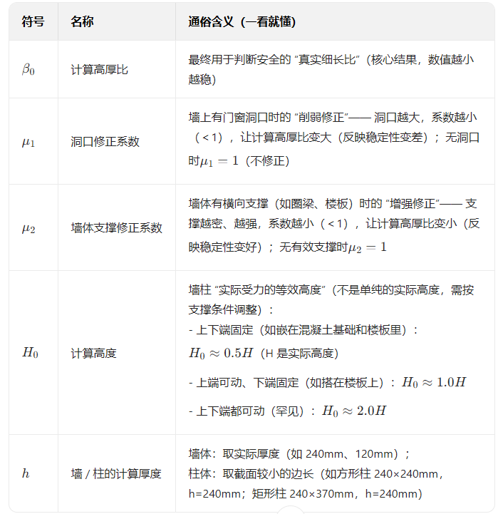 这就是高厚比的核心逻辑:纯靠 “高度 ÷ 厚度”,初步判断墙柱的稳定潜力。