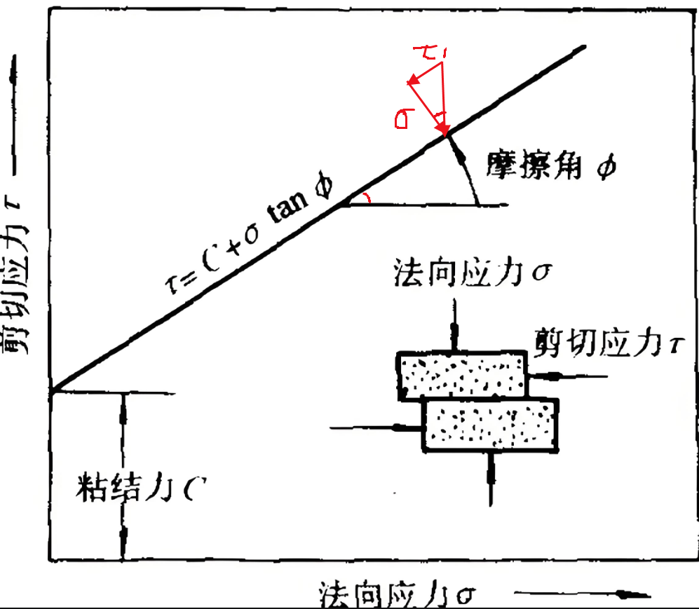 法向应力 σ:垂直于受力面的压力,比如上方土层的重量压在这个点上,相当于 “往下压的力”。