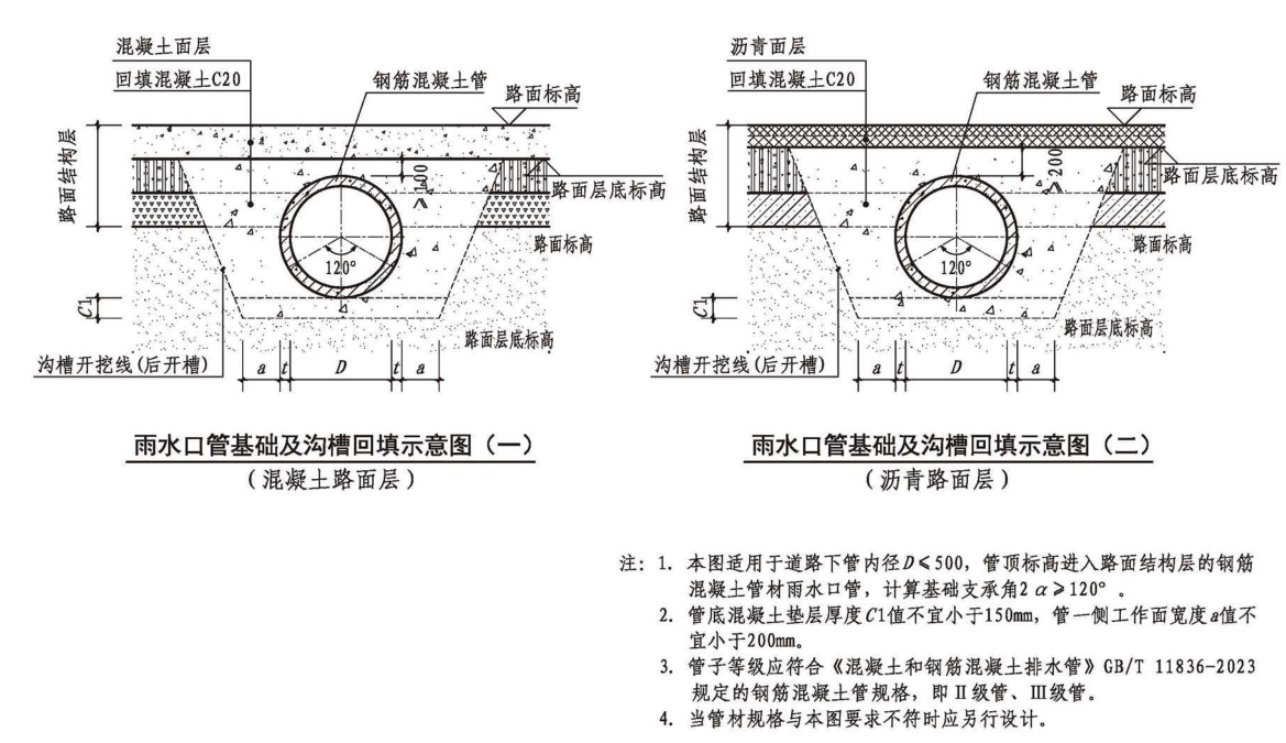 6.7 当管顶覆土厚度小于0.7m时,管道可能存在抗浮稳定不满足、进入路面结构层等问题,需要单独设计,本图集给出雨水口管进入路面结构层条件下的参考设计方式;