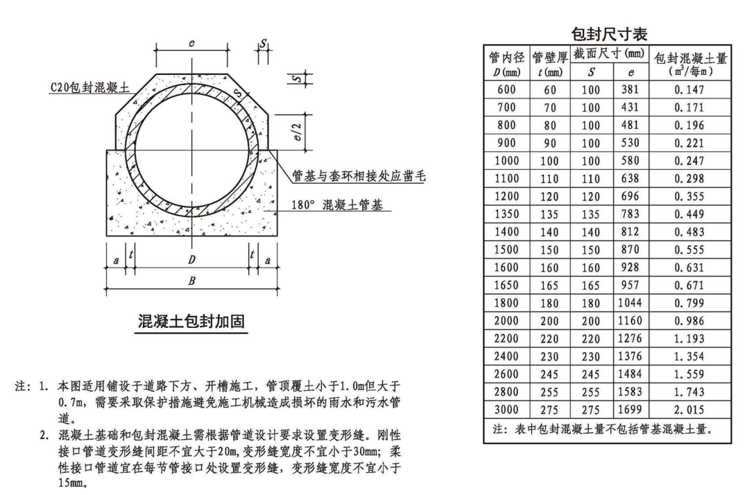 6.8 当管道在道路下方,管顶覆土厚度小于1.0m但大于0.7m时,管道宜采用180°混凝土基础,并实施包封混凝土加固(详见第20页),以避免施工机械对管道造成损坏。